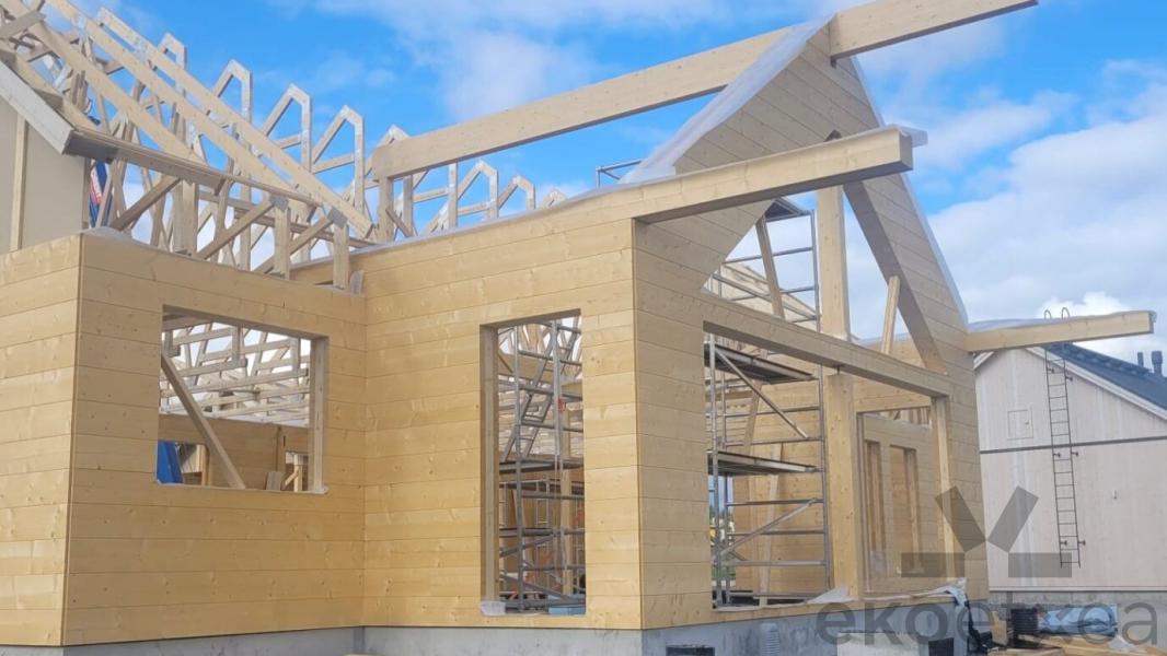Esta es la más empleada por Ekoetxea®. Los troncos de pino rojo macizos suelen tener un grosor medio de 10 cm. Para laminarlos, se cortan por la mitad, y se encolan en oposición a los anillos de crecimiento para evitar las fendas o grietas (aunque dichas grietas no perjudican de ninguna manera la tarima). En el proceso constructivo, los muros de láminas de pino rojo incorporan un trasdosado interior de lana de roca de unos 10 cm con barrera de vapor, añadiendo un friso interior de unos 20 mm, resultando una estructura exterior de aproximadamente 22 cm. La mayoría de las viviendas construidas con este sistema obtienen la certificación energética A.