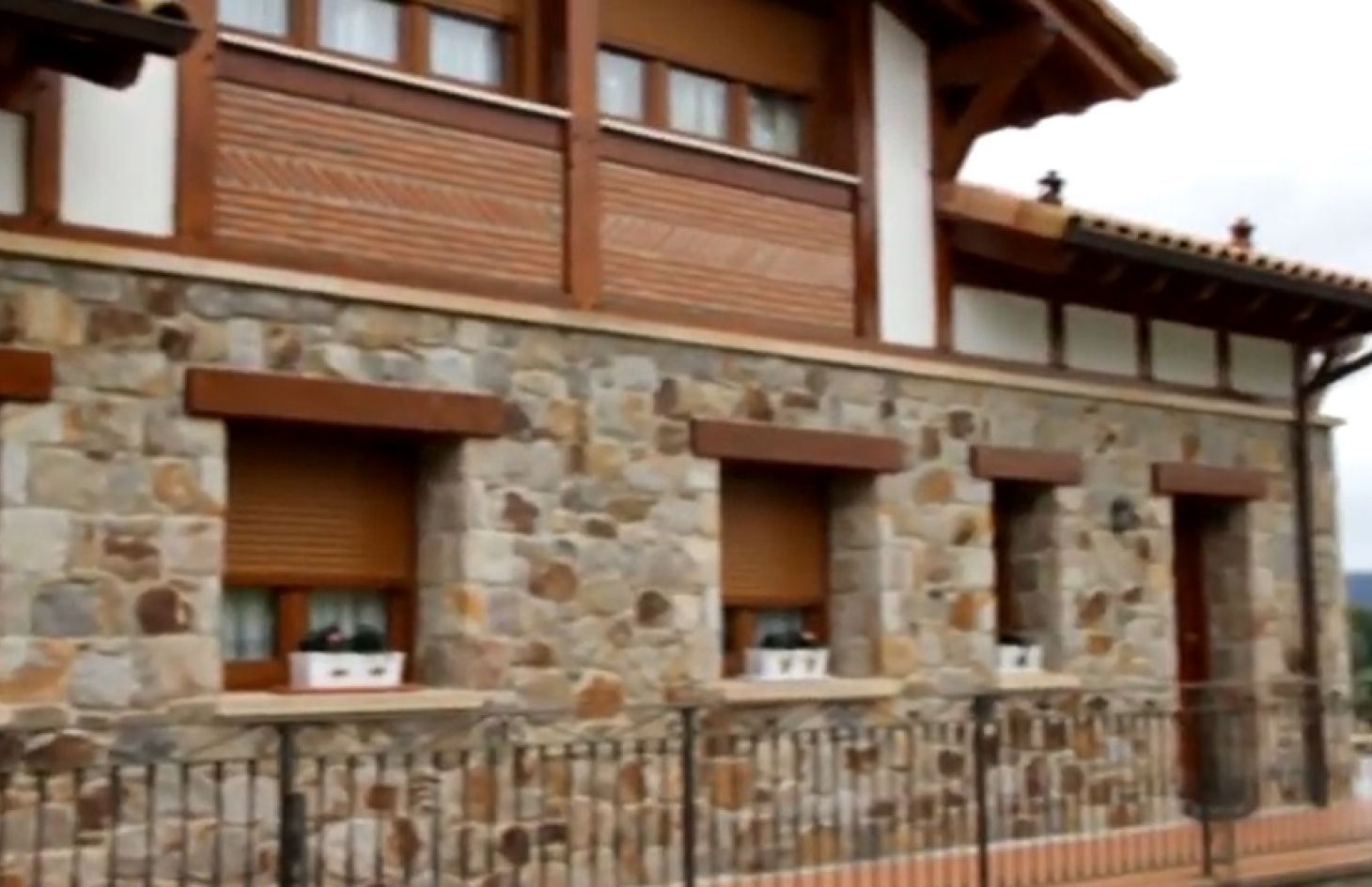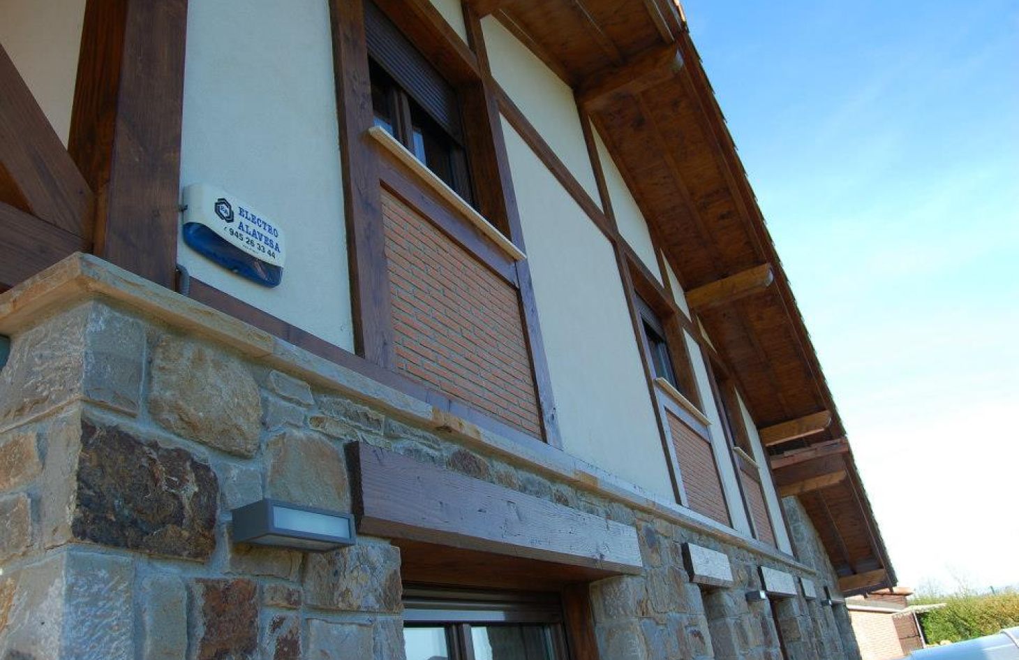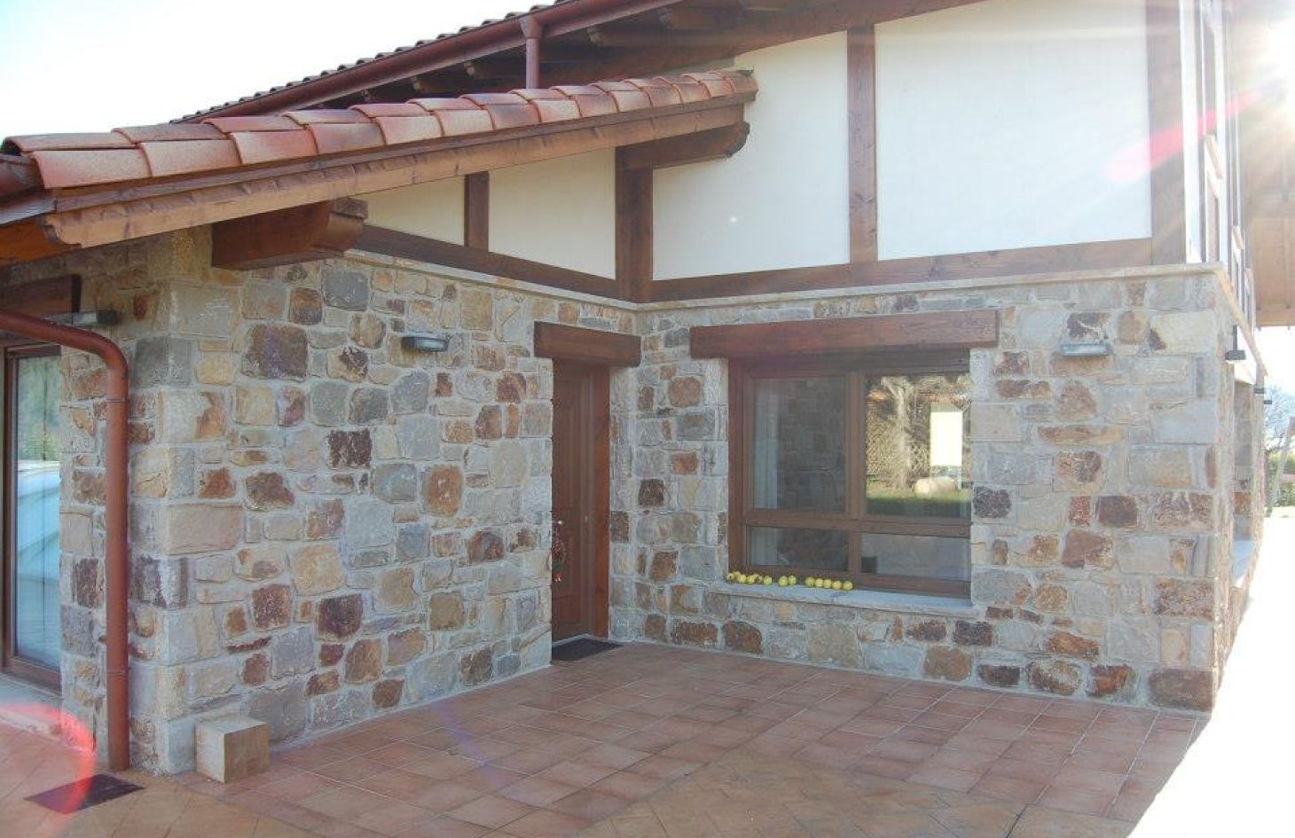 Para el exterior, se ha optado por colocar un aplacado de piedra hasta la altura de los dinteles de las ventanas. A partir de ahí, se utiliza una pintura plástica especial en tono claro combinándolo con elementos de madera.