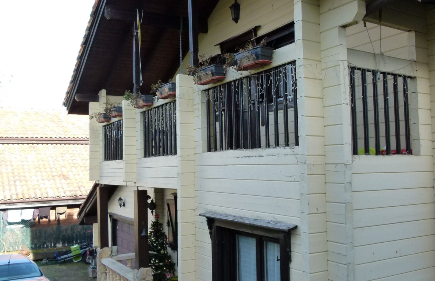 La estructura de madera se levanta sobre dicho forjado, utilizando un sistema de troncos macizos planos de 92 mm de espesor en madera de PINO ROJO FINLANDES con aislamiento termo-acústico de lana de roca o similar de 80 mm con barrera de vapor y panelado interior de friso de madera de 18mm formando todo ello un doble tabique. Entre los troncos se coloca un aislante natural denominado EKO-LANA, para atenuar y evitar las posibles filtraciones de aire a la cámara. El grosor total de los muros exteriores es de 21 cms.