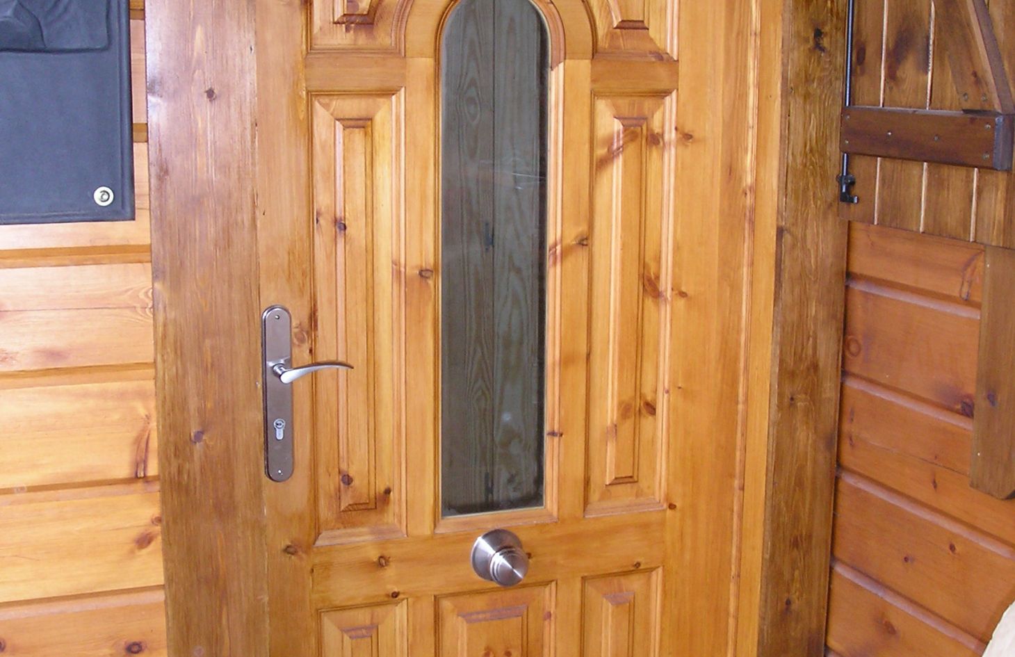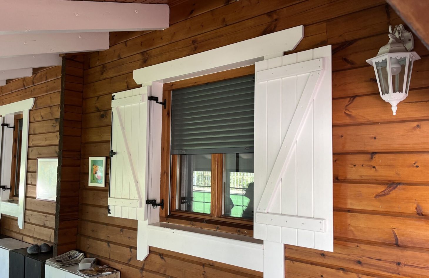 Sin duda, los propietarios acertaron pintanto las contraventanas y algunas vigas del porche y garaje en color blanco, dando más claridad a la estancia. El blanco combina muy bien con el color de madera de pino rojo finlandés.