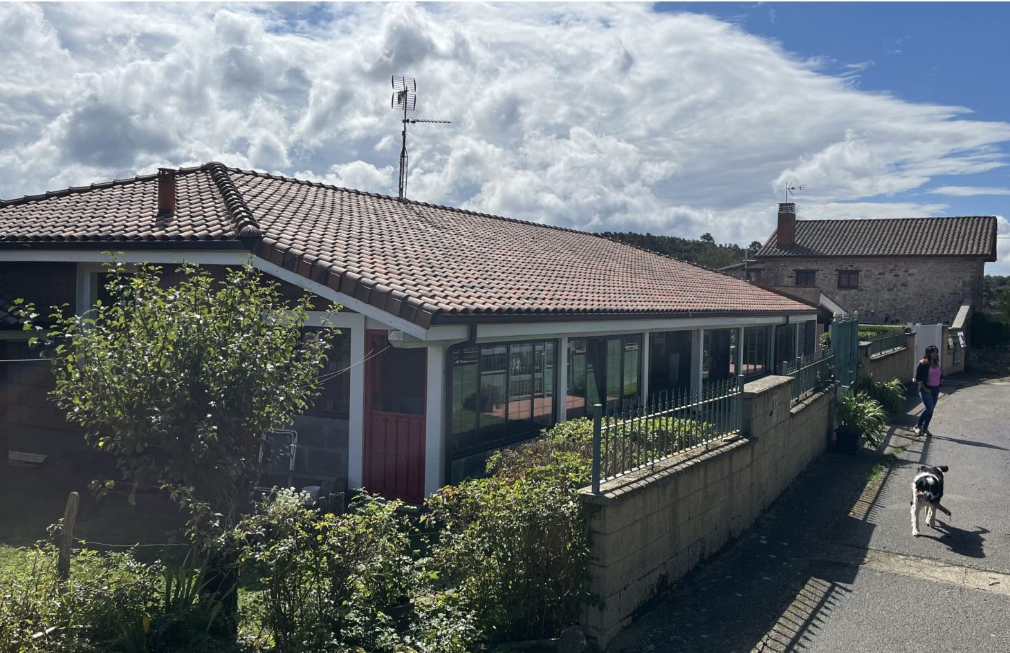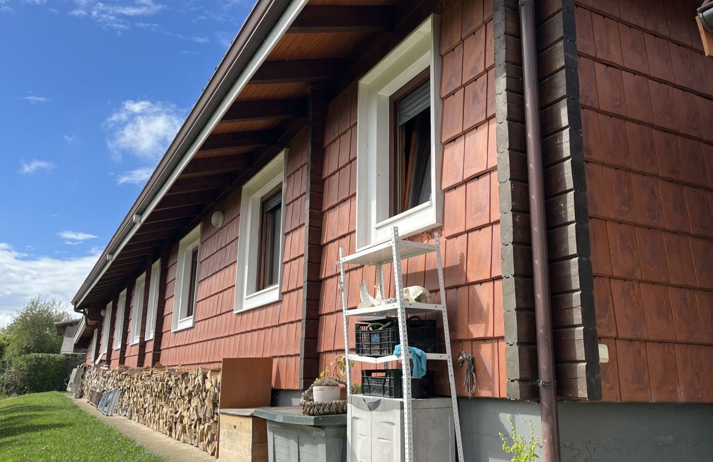 La propiedad optó al cabo de los años por recubrir la fachada que vemos en la foto, donde pega más el sol, con unas plaquetas de teja plana (como vemos en la fotografía), principalmente por dos motivos: Evitar que el sol y la lluvia pudieran deteriorar la fachada de madera. A su vez, dichas plaquetas de tejas planas están apoyadas sobre unos rastreles, creando una cámara de aire adicional, aislando todavía más la vivienda en su interior.