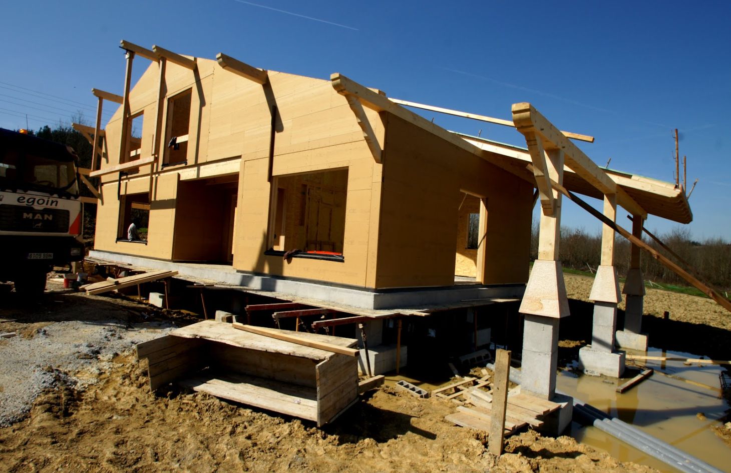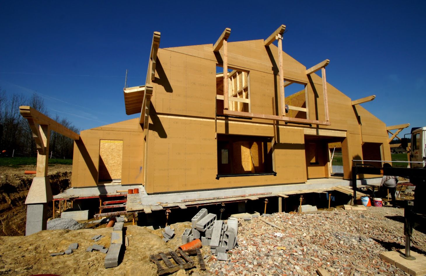 La estructura de madera se levanta sobre ese forjado sanitario, utilizando bastidores grandes de entramado ligero de madera que vienen directamente de fábrica, milimétricamente cortados y con los aislantes ya colocados dentro de los propios bastidores.