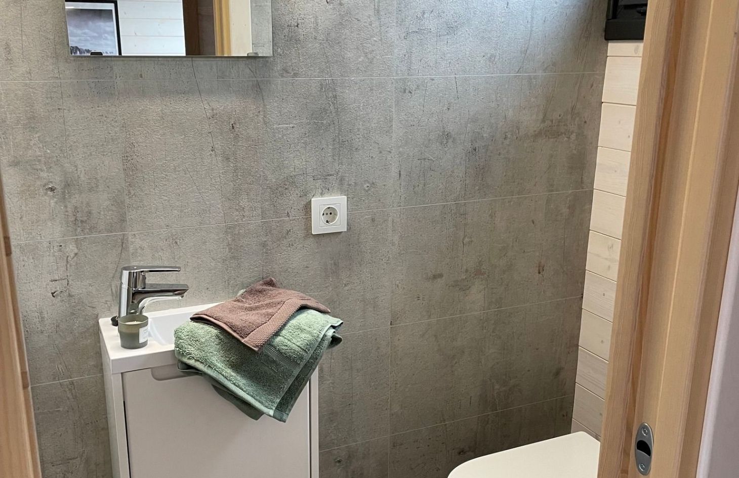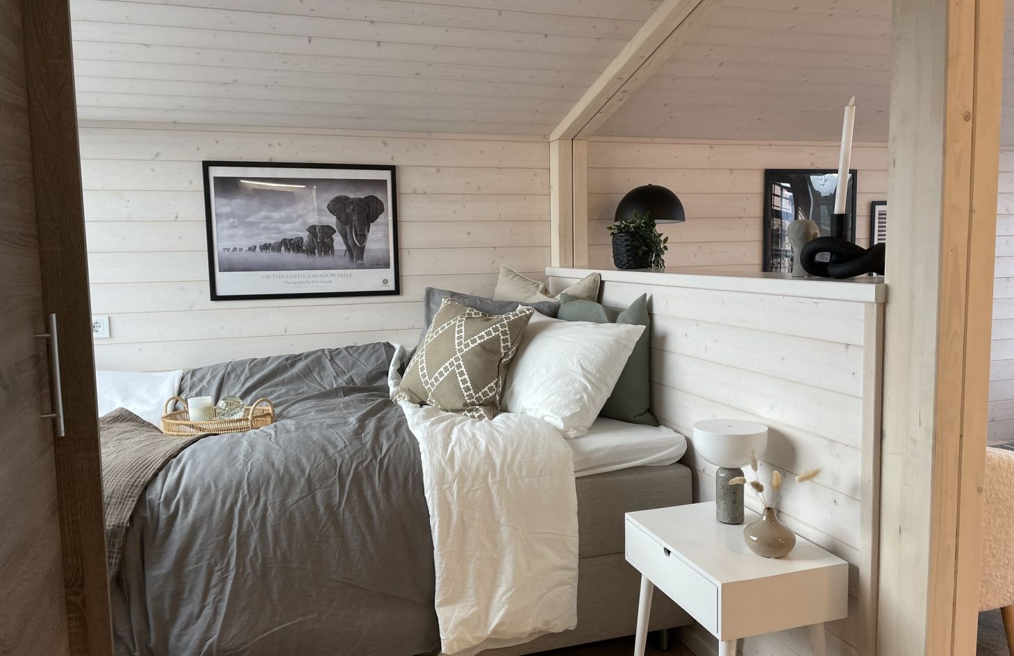 Se trata de una estructura de madera nórdica totalmente aislada con todos los acabados interiores para paredes, suelo y techo. Cuenta con una superficie útil de 17 m2, y 5 m2 de terraza. Esta unidad vino dividida en 3 módulos que llegaron en un camión desde la fábrica hasta el terreno de los propietarios y se montó en un sólo día. Con un salón comedor de unos 8,4 m2, un dormitorio de 6,4 m2 y un baño con ducha de 2 m2.